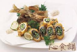 香鱼1条(1人份),紫苏约6叶,地瓜粉少许,芦笋3条,海苔1/2张(切细条),蛋黄1个,柠檬1/2个,胡椒盐少许