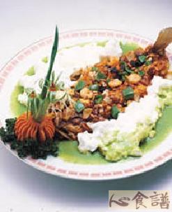 黄鱼1条,蛋白4个,青豆仁汁3大匙,葡萄干少许,松子少许,配料:1/4个,青椒1/2个,香菇4朵,红萝卜1/4条,海蔘1/2条,虾仁2两,高汤1/2碗,蕃茄酱1大匙,盐少许,糖1大匙,醋1小匙,太白粉水少许,葱1支,姜片3片,米酒1大匙,盐1小匙,味精少许,胡椒粉少许,水3大匙