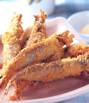 3.热一锅油,油温约150℃,将作法2的鱼一条一条下油锅炸至金黄色,捞起沥干油装盘,食用时沾椒盐粉即可。
