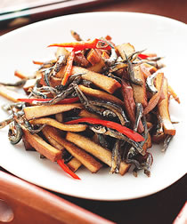 4.于作法3的锅中加入作法2的黑豆干条、丁香鱼和所有调味料,以中火拌炒均匀至入味即可。