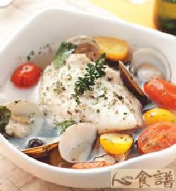 石斑菲力200公克,蛤蜊6颗,红小蕃茄3颗,黄小蕃茄3颗,香料橄榄8颗,白酒20㏄,橄榄油15㏄,高汤150㏄,新鲜九层塔3片,新鲜百里香2支,义大利什锦香料适量,盐适量,胡椒粉适量