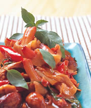 4.热锅,加入少许油将炒辣椒酱爆香后,加入作法1、3处理过的材料及调味料。