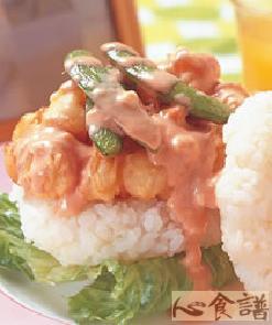 a.新鲜小干贝120公克,甜豆3支,b.低筋面粉30公克,水30公克,蛋黄1颗,c.熟米饭160公克,美生菜1片,美奶滋18公克,蕃茄酱18公克,优格10公克,辣椒酱2公克,柠檬汁6cc