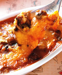 3.将咖哩酱、高汤拌入作法2的锅中后,倒进烤碗中,再撒上一层起司丝,即为半成品的焗烤咖哩鲜蚝。