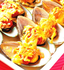 淡菜12颗,橄榄油1大匙,蒜头2瓣,洋葱碎50公克,白酒1大匙,蕃茄红酱12大匙,起司丝100公克,巴西里末适量