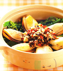 a.芥兰菜300公克,淡菜400公克,b.豆豉20公克,蒜末20公克,姜末30公克,辣椒片15公克,葱花30公克,酱油2大匙,糖1大匙,香菇精1/2小匙,米酒2大匙,水600㏄