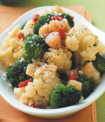 白花菜100公克,绿花菜100公克,胡萝卜65公克,枸杞15公克,干贝10公克,清高汤400公克,盐6公克,黑胡椒6公克,低脂起司粉35公克