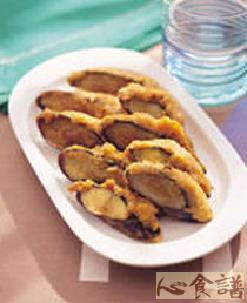 (6)将油锅预热至170℃,再放入做好的茄子,炸约3∼4分钟,表面呈金黄色,内馅熟后即可捞起,将油沥干,依序排入盘中即完成。