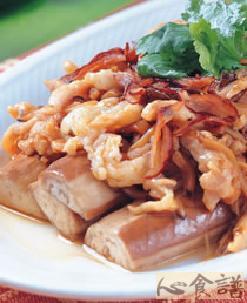五花肉切成丝状或丁状,2/3放进锅里用小火炸出猪油,将油渣捞起,猪油待用