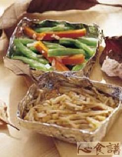 (3)将金针菇与调味料b拌匀,放入铝箔纸作成的盒子里包起,放入烤架上烤至软化熟透,即可食用。