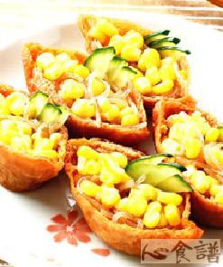 3.将市售寿司豆皮一个个轻轻将剥开,填入作法1的蒟蒻丝、玉米粒及作法2的小黄瓜片即可。