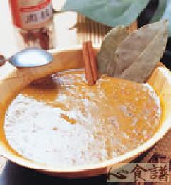 2.热锅以小火用油将作法1的酱料炒煮约1分钟,加入月桂叶、南姜粉、姜黄粉、香茅粉、丁香、肉桂、小茴香、胡荽粉、黑胡椒粗粉拌炒约1∼2分钟至香味出来。
