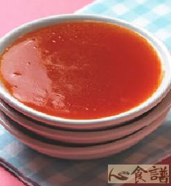 腌红梅肉1大匙,蕃茄酱4大匙,白砂糖2大匙,白醋100㏄,柳橙汁50㏄,水500㏄