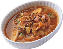 2.另取一锅放入蒜头末、洋葱末炒香,加入白酒、牛高汤,用小火微煮20分钟,再加入作法1.煮一下,以糖、盐、黑胡椒粗粉调味,最后撒入香菜末即可。