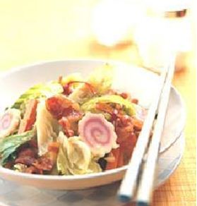鸣户卷1/2条,高丽菜苗225公克,红萝卜75公克,培根3片,蒜头2瓣,红辣椒1/2根,鲜美锅汁1/2包,糖少许