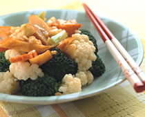 (3)起油锅爆香蒜末、红萝卜片及葱段,接着将作法(2)的花椰菜和切好的花枝卷一起放入锅中稍微拌炒,最后加入香菇蚝油和太白粉拌炒均匀即可。