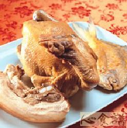 4.将鸡摆在中间,五花肉、鱼摆在两侧即完成牲礼。