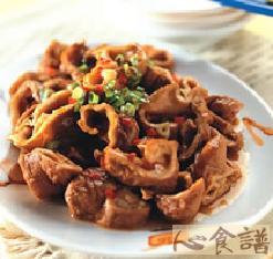 主料:鲜大肠头500克。调料:色拉油50克,盐4克,味精2.5克,整干椒、草果、八角、桂皮各5克,料酒15克,姜块、葱结、红油各20克,生粉10克。