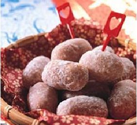 2.作法1的洋芋皮平分成35公克为一小糰,再包入莲蓉25公克,并用水沾湿手椭圆形,最后沾上椰子丝,重复此动作至材料用毕。