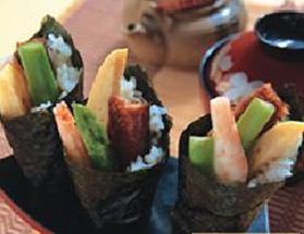 3.取1/2片海苔用火微烤,在较不光滑的一面舖上少许寿司饭,放上芦笋、鳗鱼、厚蛋烧以及作法1的虾子,然后从海苔的左下角开始卷起,卷成圆锥状,用一粒米饭将接合处粘好即可。