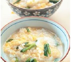 3.将米饭和鸡高汤一起熬煮,略带稠状时,再把韭菜段放入一起煮,然后加入酒、味醂、盐调味,最后把蛋汁沿着锅缘,以顺时针方向淋入,盖上锅盖后熄火,略微焖一下即可。