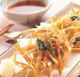 红萝卜30公克,南瓜30公克,地瓜30公克,牛蒡40公克,鸭儿芹2支,低筋面粉适量,萝卜泥适量,蛋黄150cc,低筋面粉100公克,出汁250cc,酱油50cc,味醂50cc