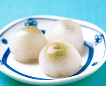 3.取一有小圆洞的容器模型(如圆球巧克力模),先置入少许作法2的粉煳,再放入抹茶馅,最后再加入粉煳直至填满,冷却后即可扣出,冰凉后食用风味更佳。
