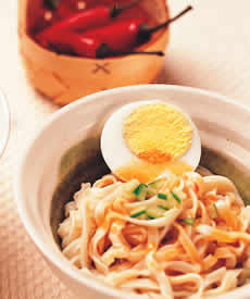 阳春面150公克,蒜仁20公克,韭菜2根,花椒10公克,红辣椒粉30公克,沙拉油80 ㏄,水3000㏄,豆芽菜30公克,a.麻酱汁1大匙,蚝油1茶匙,麻辣油1茶匙,盐1/4茶匙,细砂糖1/4茶匙,面汤100㏄,鸡精粉少许,b.盐1/2茶匙,水10㏄