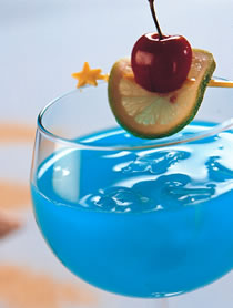 可尔必思20cc,七喜汽水150cc,蓝柑香糖浆20cc,柠檬片1片,樱桃1颗,冰块适量