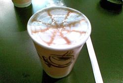 5.将一勺焦糖浆放入一次性裱花袋,剪细小口,在奶泡上挤上花纹即可。