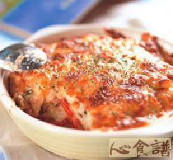 4.取一烤盘,先铺入作法1的板条做底,再依序铺上作法2的茄子、作法3的面煳、番茄、面煳、马铃薯,最后撒上起司条即为千层面皮。