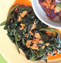 3.另热一锅,加入清水及一点盐、沙拉油煮开后,放入地瓜叶汆烫一下即捞起沥干水份,最后淋上作法2的酱料即可。