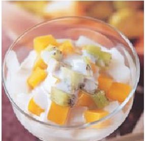 3.待作法2的材料稍冷后加入杏仁露、鲜奶拌匀,倒入模型中,待完全冷却时放入冰箱冷藏,食用前加入芒果丁、奇异果丁即可。