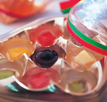 3.趁热倒入模型中,等半凝固时,再将各种水果放入定位,待果冻完全凝固即可。