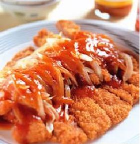 3.另起炒锅,加入洋葱丝略炒一下,续入调味料,最后再以太白粉水芶欠,并淋于作法2的成品上即可。