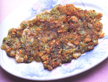 3.把镬烧热后加点油,将瓜浆放入镬中,收慢火煎至离镬,反面再煎至熟,一碟美味的葫芦瓜烙便告完成。