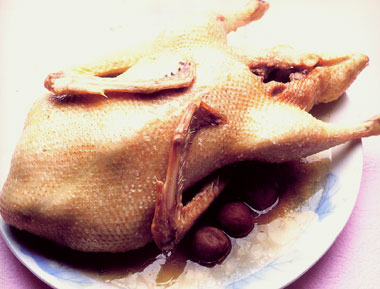 3.把另外4粒梅子和余下的调味料混和,然后加上2杯花雕酒,淋于鸭身之上。把鸭放入蒸笼蒸约1小时。