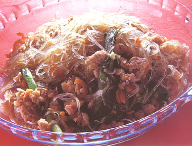 薯粉丝球18扎,虾米2两,青蒜4两,半肥瘦猪肉8两,鱼露1汤匙,胡椒粉适量,上汤11/2杯