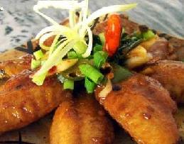 3、烧镬下油,放入鸡翼炸至色泽大红而皮脆,以熟为度,捞起盛于碟中便成。
