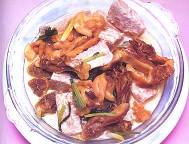 4、蒸汽加热1小时取出反扣于碟中,原汁勾芡淋上,菜胆围过即可。