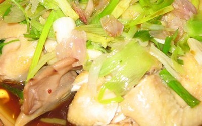 3.将腌好的鸡肉放入蒸笼里,以大火蒸40分钟后,取出放凉再剁成小块,舖上葱丝、姜丝、红辣椒丝及蒸鸡汤汁。