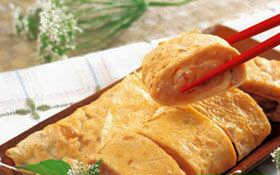 (4).平底锅内倒入油,将油沾满锅底,倒出多余的油,倒入1/4的鸡蛋汁,待蛋汁刚凝固,马上用筷子或铲子往起卷,待快卷完时再倒入1/4蛋汁,直到蛋汁完全摊完,可用手将蛋卷压。切成块,摆放在盘子内。