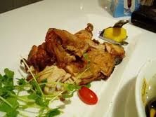2.鸡肉切成大块在蛋汁(预先打散)中浸过后,在面粉中沾一下,放入油锅中煎好。