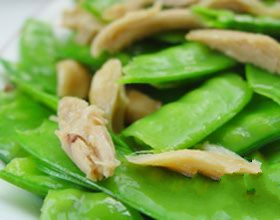 5.倾出多余油分,炒熟荷兰豆,盛起备用;