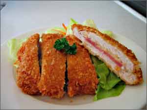 猪里肌2片,火腿片2片,起司片2片,盐少许,胡椒粉少许,太白粉少许,低筋面粉适量,蛋液适量,面包粉适量,b.高丽菜丝适量,白饭1碗