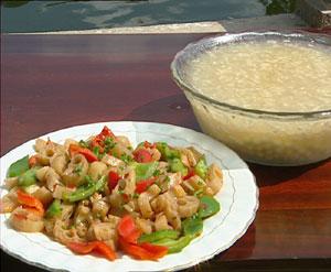 主料:鸡豆梗鸡头米,青红椒,姜丝,香葱白糖,高汤精,蒜茸辣酱,淀粉,酒酿,橙汁