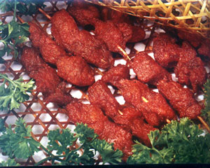 2、炒锅上火,倒入精练油,烧至五成热,放肉串炸熟,放于网上即可。