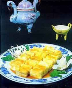 (3)锅置旺火上,放人熟猪油烧至五成热,将豆腐坯沾匀蛋泡糊,逐个下人油锅炸至挺起捞出,再将油温升至七成热时重炸至金黄色捞出沥油。锅中放人肉清汤100克,投入豆腐,加精盐(3克)、白糖以小火烧开加醋勾芡起锅装盘即成。