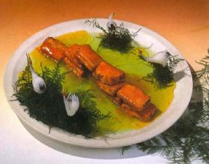 (三)锅烧热,放生油至五成热时,将火腿片挂上蛋粉糊逐片下锅油炸,起壳后捞出。待油温至七成热时,再复炸一次,至外壳脆硬金黄色时,捞出沥油,装在盘中摆成桥形。原锅留少许余油,下番茄酱略煸,下白糖、米醋、少许汤水,用生粉勾薄芡,淋油,浇在火腿片组成的“金桥”上,然后把仙鹤放在桥两边,头部朝向“金桥”即可。