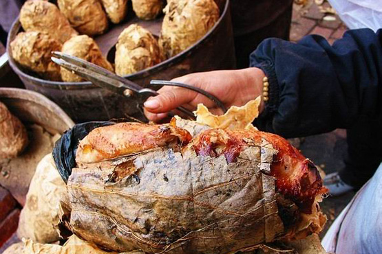 3、将封酒坛的黄泥敲碎,加食盐、绍酒和水拌和成厚糊,放在湿布上(黄泥厚约3.4厘米),在黄泥中间放上捆好的鸡,将湿布四角拎起,把鸡身包紧,然后将湿布揭去,改用废纸包裹。用竹签在泥面上戳一小孔,以供烘烤时排出热气,防止泥层破裂。最后将包好的鸡放进烘箱,用旺火烘烤40分钟,使黄泥烘干取出,用湿泥将小孔涂没,再入烘箱烘烤30分钟后,改用文火煨烤(每隔20分钟翻一次身),共烘煨四五小时即熟。食前先敲掉泥壳,除去小绳和荷叶,将鸡装盘,淋麻油少许,带芝麻酱、葱白段供蘸食。